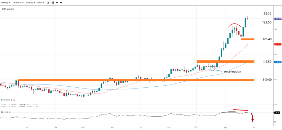 The greenback has done extremely well against the Japanese yen in 2022. In February, USD/JPY accelerated after the pair tagged the 50-week average near 114.30, extending 20% higher for a 20-year high at 135.20. But, momentum has recently started to wane (as the RSI shows below).