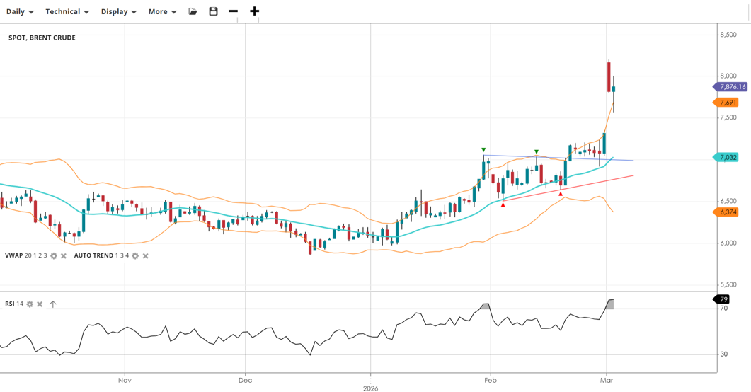Brent Crude has seen an aggressive breakout and is trading in a highly impulsive bullish phase. While the trend is strongly upward, momentum indicators have entered overbought territory, suggesting the market is significantly stretched relative to its mean.