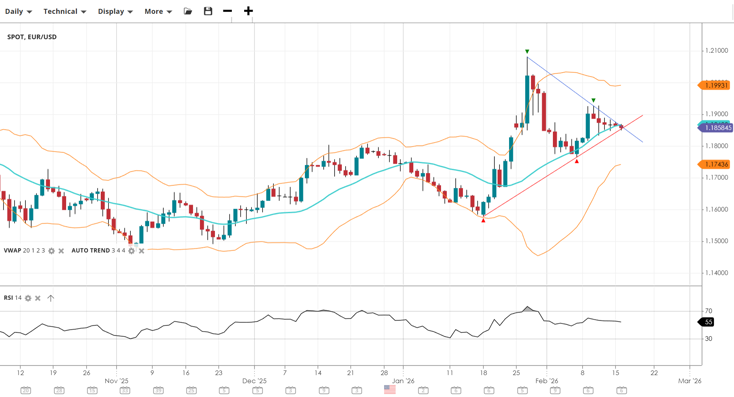 EUR/USD is tightly wound around its VWAP of 1.1852, showing signs of heavy consolidation after its recent volatility. The RSI at 55 confirms a slight bullish bias, but the pair is currently trapped in a narrow range between the 1.1744 support and 1.1993 resistance.