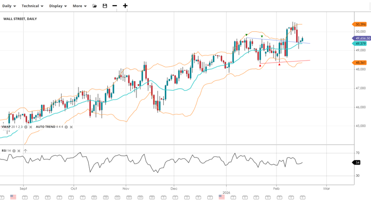 Wall Street has pulled back from its recent attempt at the 50k resistance level and is now consolidating. It remains above the VWAP, maintaining its broader bullish structure. RSI has cooled to 54, suggesting a transition from aggressive buying to a more neutral, healthy consolidation phase.