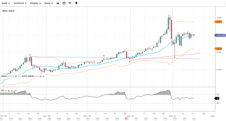 Gold has stabilised following the extreme volatility seen in early February. It is trading back above the 4,900 level and the VWAP (4,923). Momentum has recovered with the RSI at 53, suggesting the worst of the sell-off may be over, though resistance at 5,391 remains a significant hurdle.