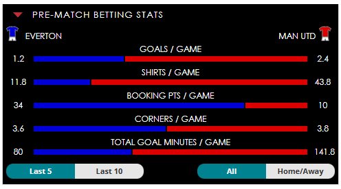 To see all the Everton v Man Utd betting stats and form, visit our pricing page to view our Pre-Match betting stats table or hover over/tap the chart image to see previous outcomes for that particular market.